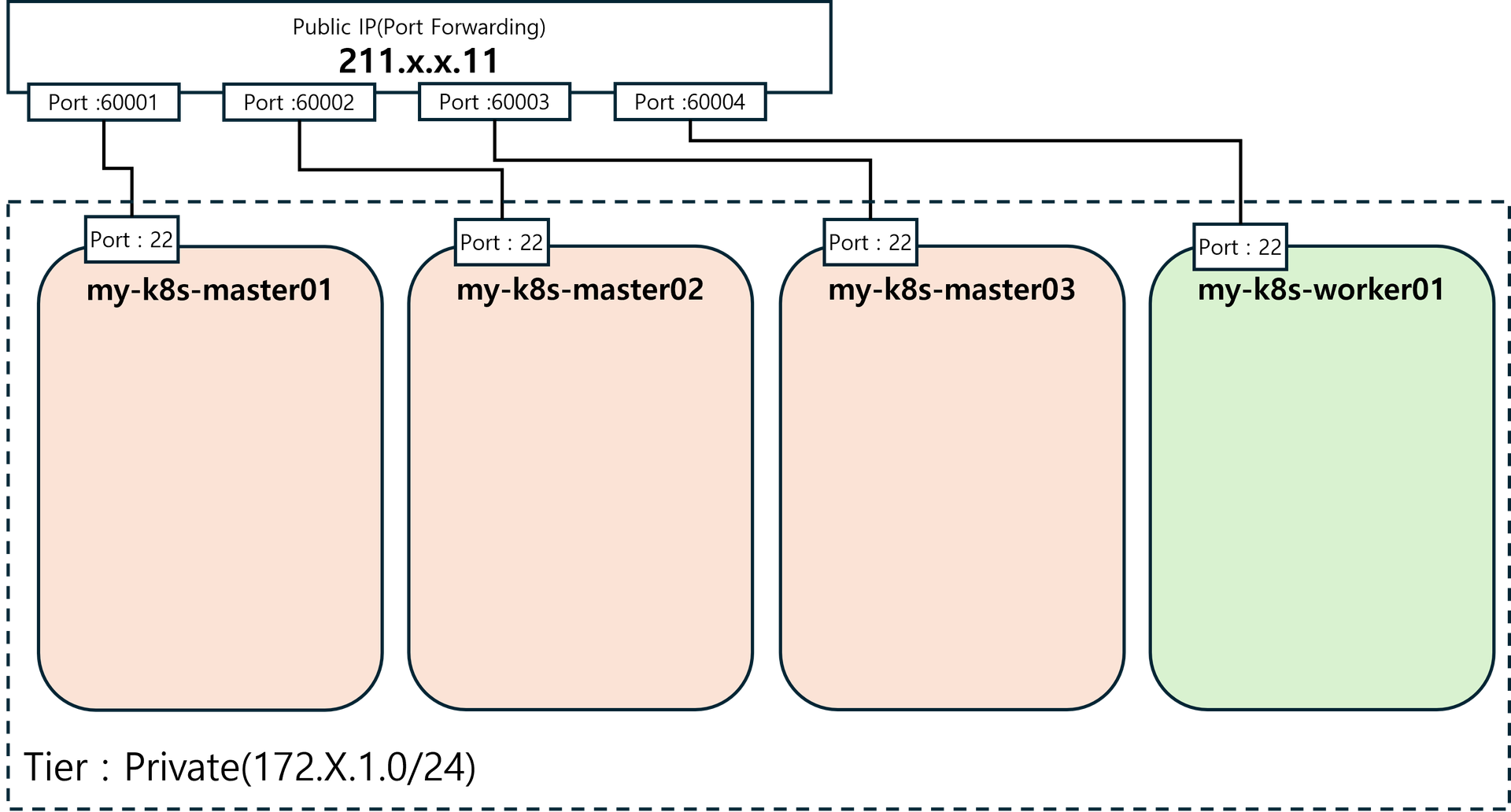 - my-k8s-master01 → Private Port : ‘22’ / Public Port : ‘60004’