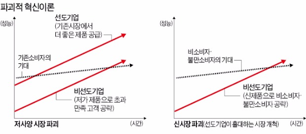 이러한 변화가 가능할 수 있는 이유는 기존 시장 선도 기업이 자사에게 가장 유리한(가장 수익성 높은)고객에 초점을 맞추어 기술을 지속적으로 향상(존속적 혁신) 시키려는 경향에 있습니다. 이러한 과정에서 기존 소비자의 대다수가 원하는 기대 보다 훨 높은 수준의 성능을 가진 제품을 제공하거나, 아예 외면 받게 되는 고객 층이 생기게 됩니다.