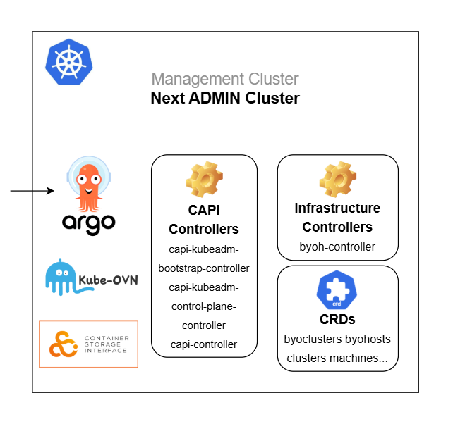 - Cluster API 가 동작하는 곳. Cluster API Controller, Infra Provider가 실행되는 곳. Cluster API의 모든 CRD가 생성되어 있는 곳.
