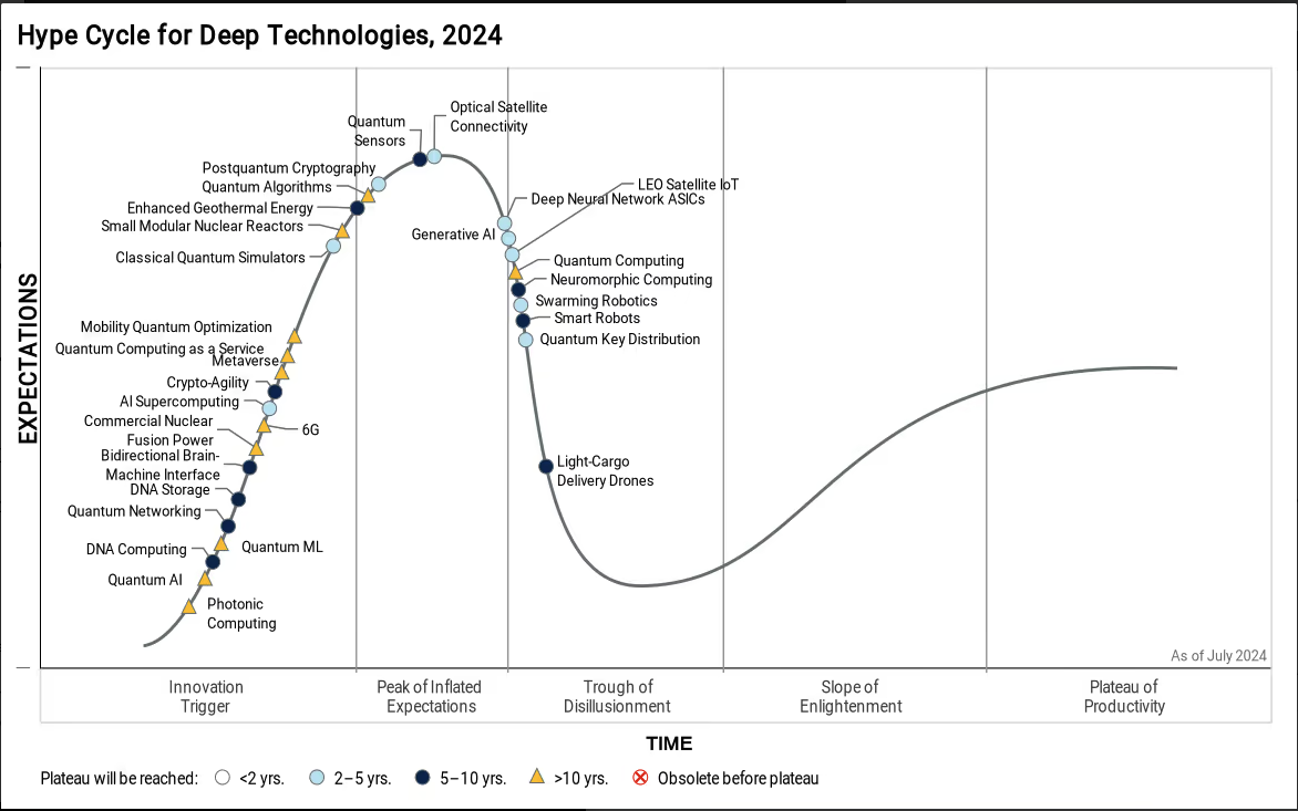 이처럼 계산 속도도 중요하지만 결과의 정확성도 중요하기 때문에 아직 사용화가 되기에는 이른감이 있습니다. 이를 대변하듯 Gartner의 Hype cycle에서도 Quantum Computing기술은 환멸의 계곡(Trough of Disillusionment)*를 지나는 중이며, 아직 기술이 시장에 자리를 잡기에는 10년 정도의 시간이 걸릴 것으로 예상됩니다.