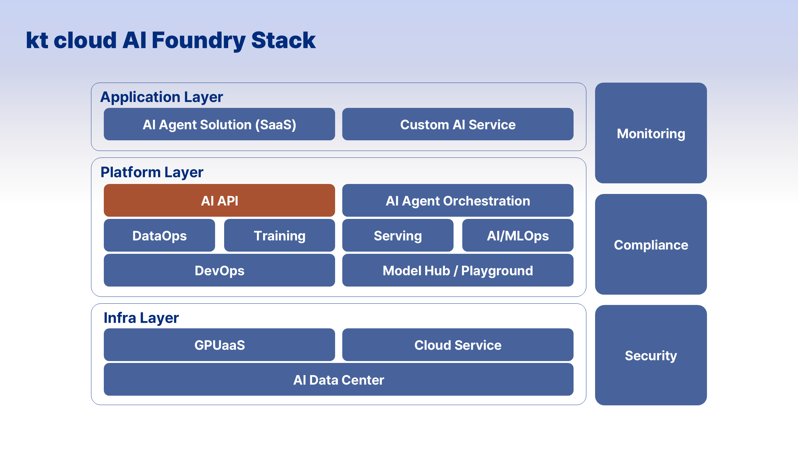 kt cloud의 AI Foundry는 바로 이 필요에서 출발한 플랫폼입니다. 단순히 모델을 제공하는 도구가 아니라, AI가 실제 업무에 안정적으로 녹아들 수 있도록 설계된 운영 중심 구조를 갖추고 있습니다.