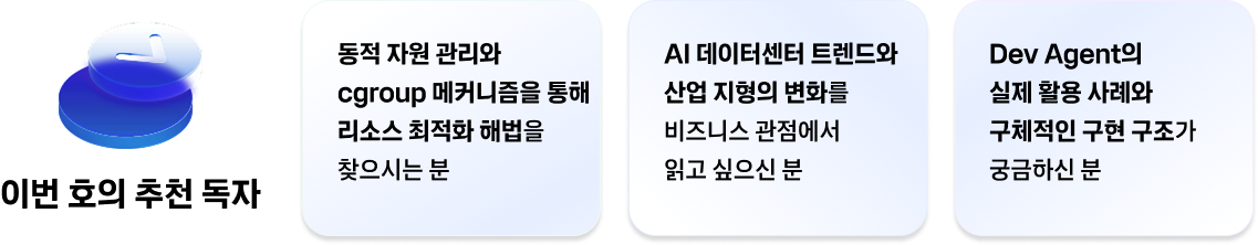 AI 경쟁의 승패는 '누가 더 빨리 증명하느냐'에 달려 있습니다. 가능성에 머물러 있는 기술을 비즈니스 가치로 빠르게 전환하는 '실행력'이 기업의 격차를 만듭니다. 이번 케클s피드에서는 리소스 최적화 전략부터 AI 데이터센터의 투자 흐름, 그리고 현업에 즉시 투입 가능한 Dev Agent 활용법까지, AI 시대를 주도하기 위해 지금 바로 짚어봐야 할 실행 전략들을 담았습니다. AI 시대를 리드할 실행 전략, 지금 확인해보세요.