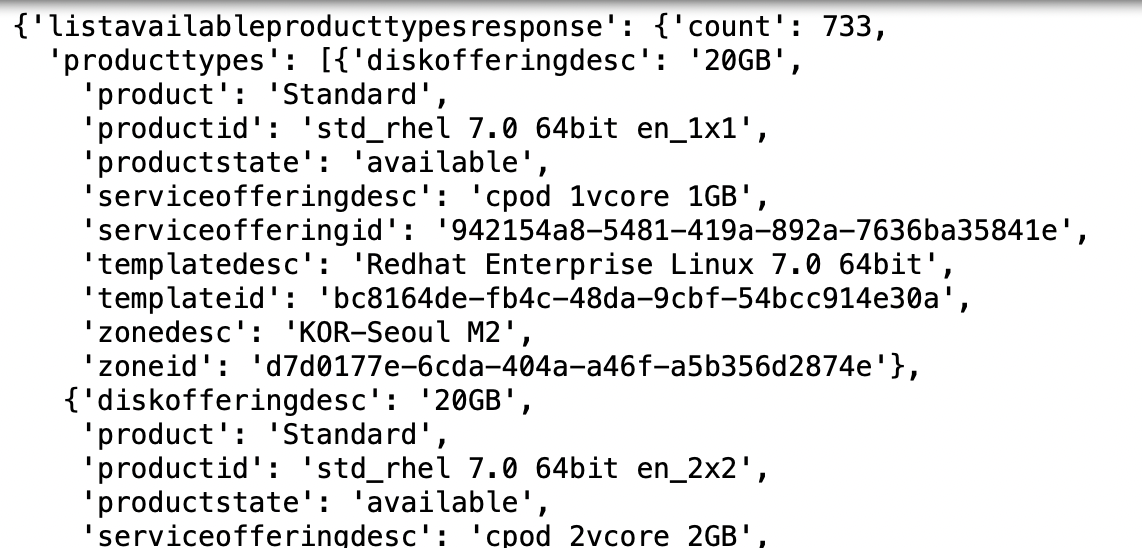 listAvailableProductTypes API는 KT Cloud에서 제공하는 가상서버의 메타 정보(상품 타입, 스펙, 존 정보 등)를 제공해줍니다. 하지만 아래와 같이 json 혹은 xml 형식으로 결과값이 표시되므로 가독성은 좋지 않습니다.