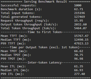 (A100 16.73 requests/s, 6919.96 tokens/s)
