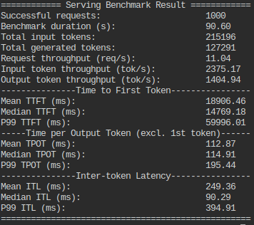 직접 실행한 vLLM 모델 서빙 서버로, benchmark_serving.py를 통해 특정한 성능은 아래래와 같습니다.