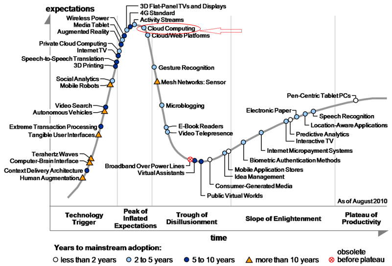가트너 Hype Cycle에 따르면, 이미 2010년도에 Cloud는 '최고로 주목 받는 기술 중 하나'였습니다.