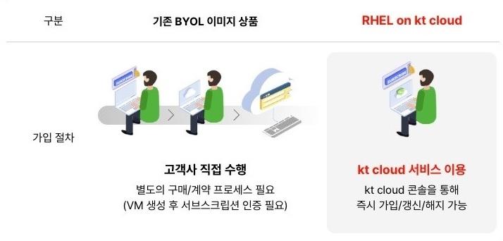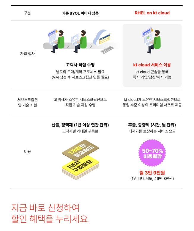 | 또한, 별도 Red Hat Enterprise Linux의 서브스크립션을 시장 내에서 구매하는 비용보다 훨씬 저렴하게 제공합니다. ‘RHEL on kt cloud’는 연간 46만8천원(월 3만9천원)만 납부하면 모든 이미지를 사용할 수 있어, 경쟁사 CSP와 타 상품 대비 비용 절감 효과를 톡톡히 누릴 수 있습니다. ✌ |