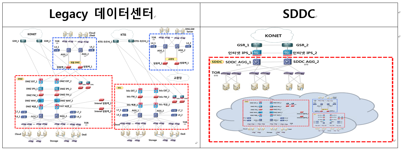 이처럼 SDDC는 다양한 데이터센서의 구성 요소를 API(application programming interface)를 통해 소프트웨어로 자동화하여 배치, 운영, 관리를 구현이 필요했고, 데이터센터라는 광범위한 대상으로 인해 구체적인 구조와 관련 신기술의 실현 방법이 포함된 비즈니스 모델 없이는 지속발전의 어려움이 존재함을 확인하였습니다. 관련 KT는 2015년부터 꾸준히 SDDC 기술을 위해 SDN/NFV 아키텍처 및 사업모델을 개발하고 도입하였습니다.