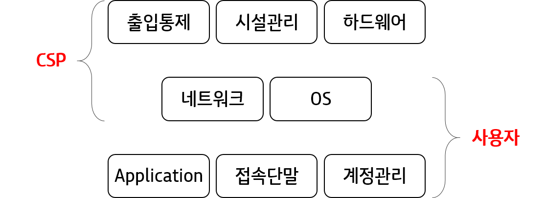 이에 반해, 클라우드 환경에서는 상당히 많은 영역을 CSP가 대신 관리하게 되는데요. CSP와 사용자가 관리할 영역을 명확히 구분하여 각자 책임지고 보호하기 위해 '클라우드 공동 책임 모델'의 개념이 등장하게 됩니다.