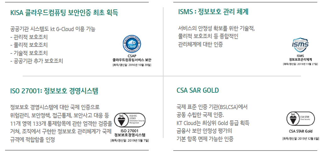 KT Cloud는 지속적으로 보안 인증을 획득하고 있습니다.
