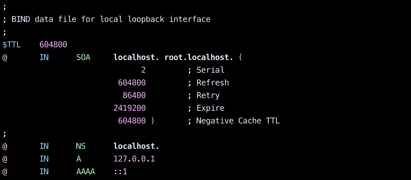 이 디렉토리 안에 있는 db.local 파일이 기본적인 zone 파일인데요, 한 번 살펴볼까요?