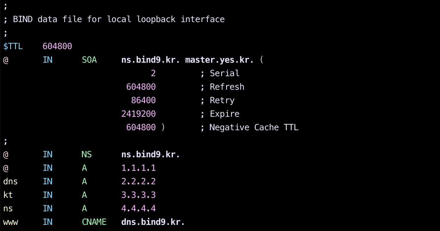 우리의 목표에 맞춰서 이 파일을 기준으로 db.bind9.zone 파일을 한 번 만들어 봅시다.