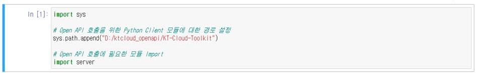 Jupyter Notebook을 실행하고, kt cloud SDK를 해당 Notebook에서 보다 편리하게 사용할 수 있도록 경로를 지정해 줍니다. (아까 확인해둔 kt cloud SDK를 다운로드/압축해제한 경로를 활용합니다.)