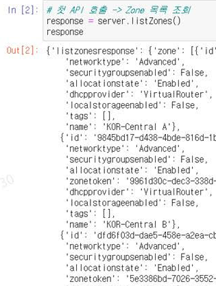 위와 같이 단 2 라인으로 매우 간편하게 kt cloud Open API인 'listZones'를 호출하였습니다.
