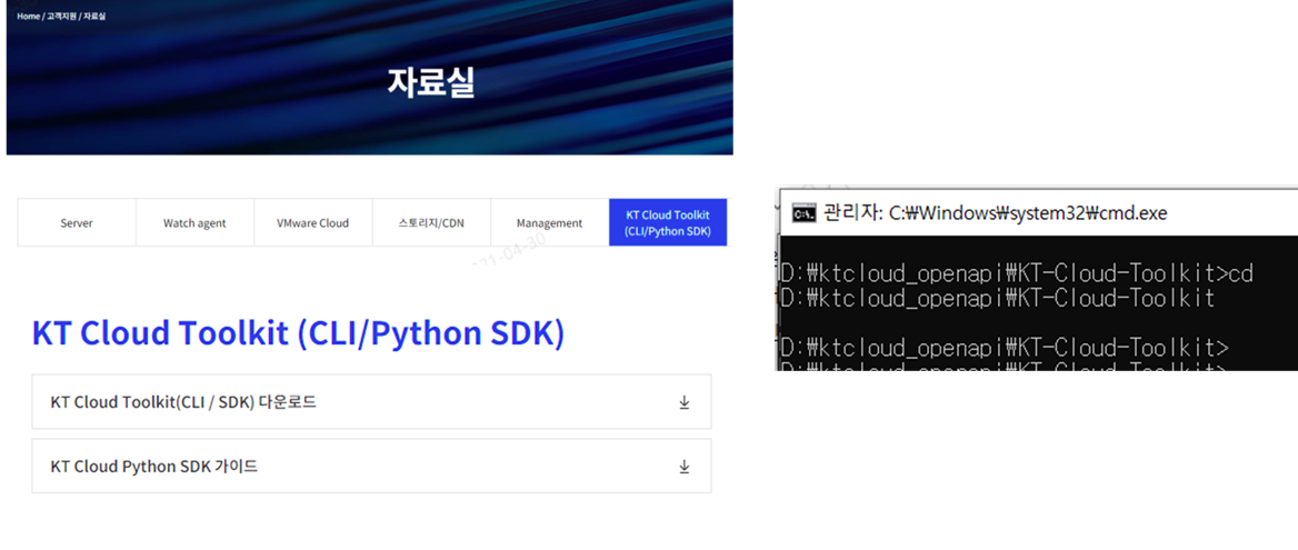 다음은 kt cloud SDK를 다운로드 하시면 됩니다. kt cloud 포탈에서 '고객지원/자료실' 메뉴를 찾아 보시면 kt cloud Toolkit이라는 항목이 있습니다. 여기에서 'kt cloud Toolkit(CLI/SDK)'을 선택하시어 다운로드 받으면 됩니다.