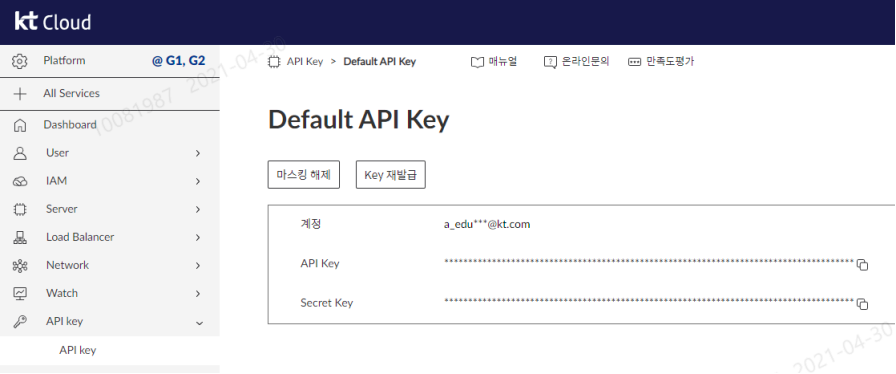 kt cloud 포탈에 접속하셔서 클라우드 콘솔을 클릭한 후 로그인을 합니다. 가장 좌측의 API Key 메뉴를 선택하시면 API Key와 Secret Key 정보를 확인하실 수 있습니다.