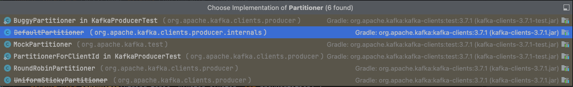 partitioner.class 설정으로 변경 가능한 Partitioner의 종류는 Test, Mock을 제외하고 DefaultPartitioner, RoundRobinPartitioner, UniformStickyPartitioner가 있습니다.