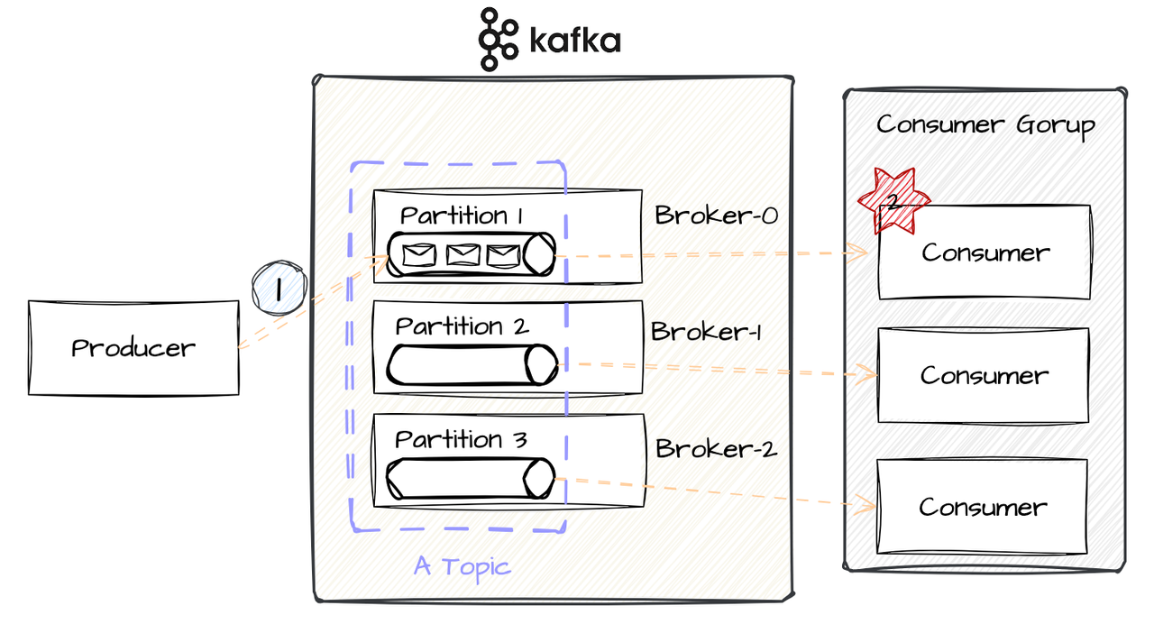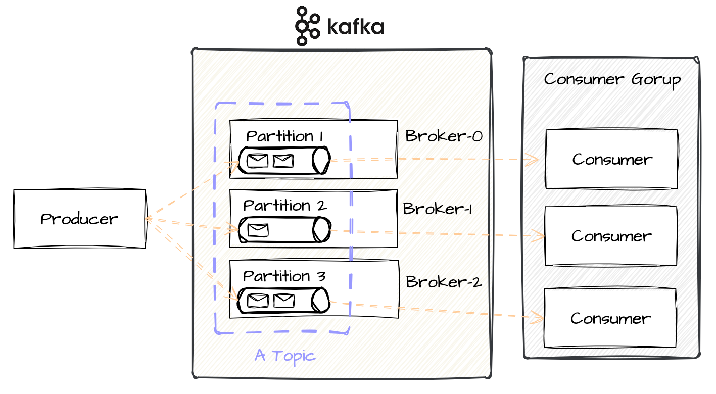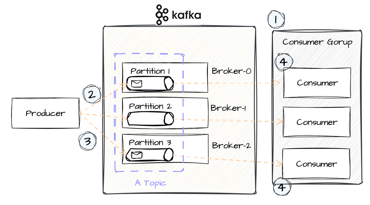 Kafka Cluster 구성, Topic & Partition 그리고 Consumer Group은 설명하기 쉽게 구성했습니다.