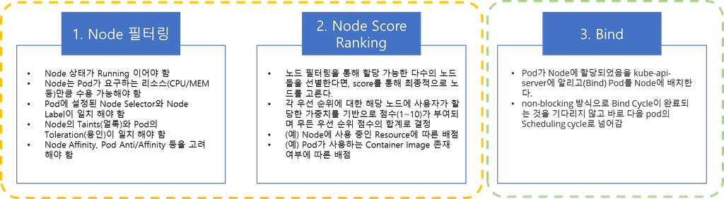 Scheduler는 아래와 같이 Filter - Score - Bind 라는 3단계 과정을 통해 적절한 Node를 찾게 됩니다.