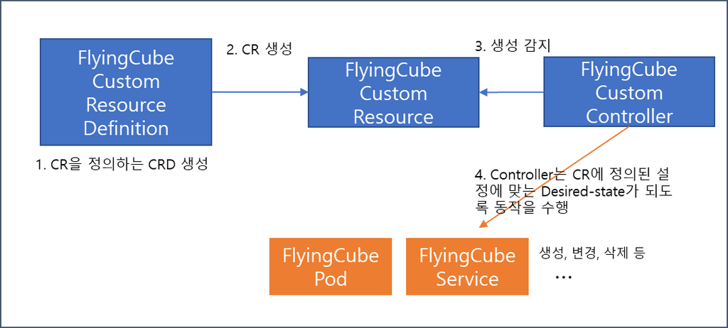 위와 같이 생성한 “Flyingcube” Resource는 api-server를 통해 etcd에 저장되지만, pod나 deployment와 같이 기존 Kubernetes Resource와는 다르게 특별한 동작을 하지 않습니다.