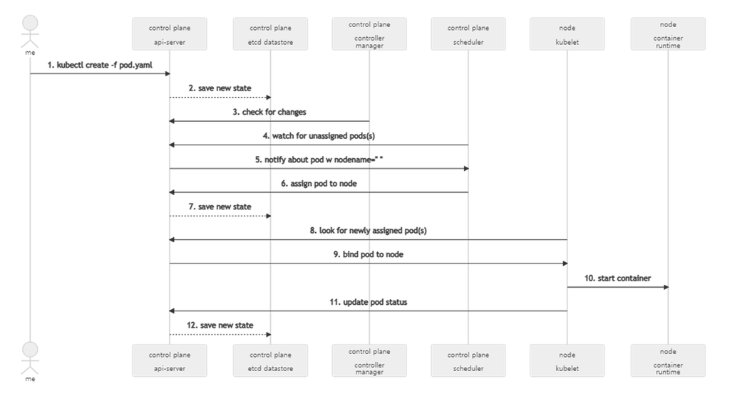 앞에서 설명한 Control Plane(api-server, etcd, controller-manager, scheduler)의 특징을 기억하면서, Sequence Diagram을 따라가며 살펴봅시다.