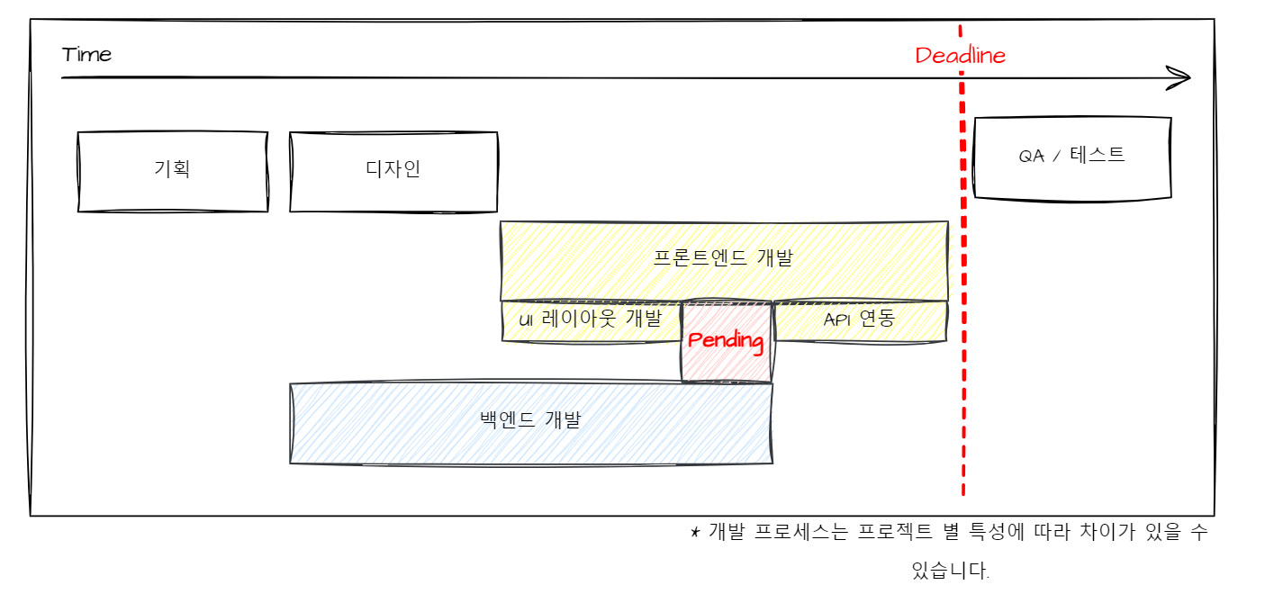 백엔드 API 개발이 예상보다 길어지는 경우, API를 활용해야 하는 프론트엔드 개발은 대기(Pending) 상태에 놓일 수 있습니다.