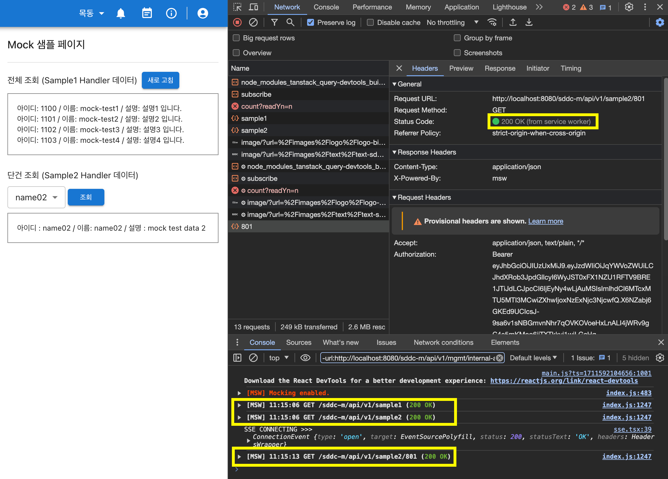 6.Handler에 등록된 API를 호출하는 컴포넌트, 페이지를 개발한 다음, Chrome 개발자도구에서 MSW가 정상적으로 동작하는지 확인합니다.