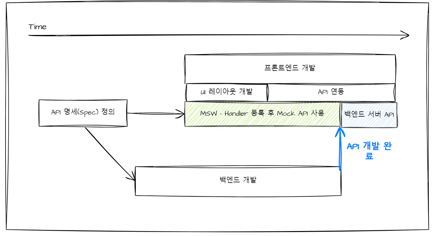 이러한 문제를 개선하기 위하여, 프론트엔드의 개발 대기 시간을 최소화 하고 백엔드와 병행하여 개발할 수 있도록 가상(Mock) 서버 환경을 구성하였습니다. 실제 API와 유사하게 네트워크 수준에서 API 연동 테스트를 할 수 있는 MSW(Mock Service worker) 라이브러리를 도입합니다.