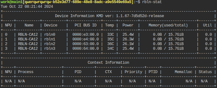 접속하여 터미널에 rbln-stat을 입력하면, 할당되어 있는 NPU 칩의 상태를 확인할 수 있습니다.