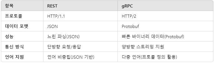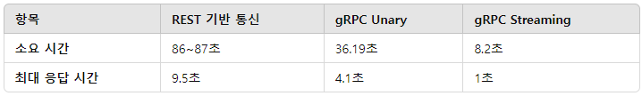 - gRPC Unary(REST와 동일하게 1:1 요청/응답) 기준으로도 REST에 비해 2배 이상 빠름
