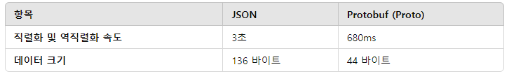 - Protobuf가 Json 포맷보다 (역)직렬화 속도가 4배 이상 빠름