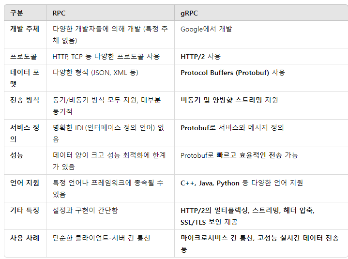- REST의 경우 클라이언트 - 서버 간 연결이 느슨하지만, gRPC의 경우 클라이언트와 서버가 동일한 .proto 파일에 엑세스하기 때문에 동일한 버전을 사용하는지 주의해야 합니다.