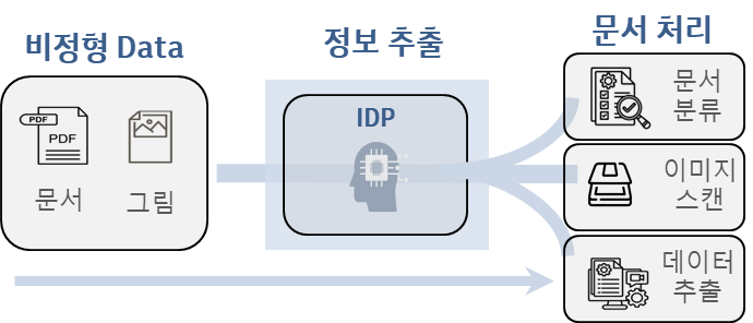 - 자동화 범위 확장: RPA만으로는 자동화하기 어려웠던 비정형 데이터 처리 작업(문서, 그림 파일에서 데이터 추출 등)을 IDP를 통해 자동화하여 업무 프로세스 전반의 자동화를 가능하게 합니다.