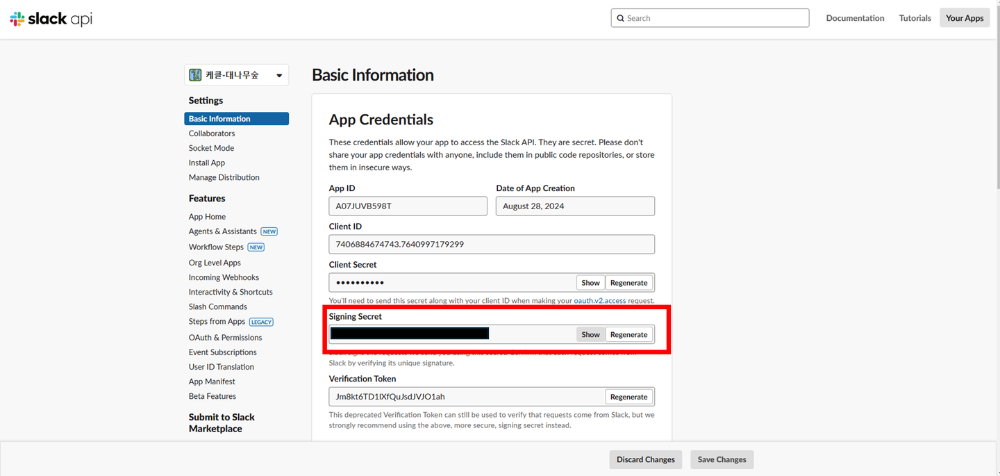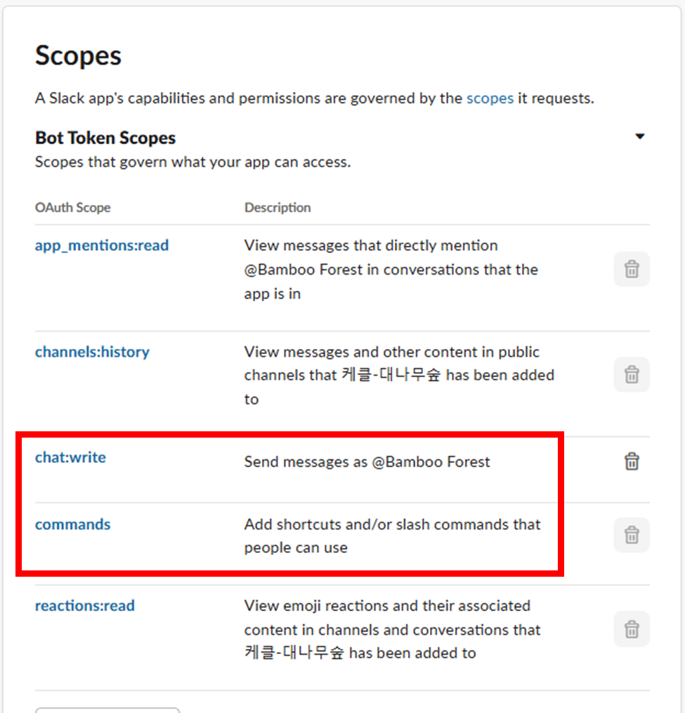 | # 앱 토큰 # basic inforamtion → Signing Secret SLACK_SIGNING_SECRET= # 슬랙 봇 토큰 # OAuth & Permissions → Bot User OAuth Token SLACK_BOT_TOKEN= # 대나무숲 채널 코드 # slack 채널 → 채널 세부 정보 하단 채널 ID SLACK_BAMBOO_CHANNEL= |