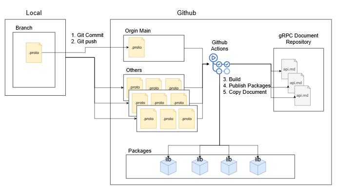 이를 위해 protoc-gen-doc 플러그인과 GitHub Actions를 사용해 .proto 파일이 변경되면 문서를 생성하고 라이브러리와 문서를 자동 배포하도록 프로세스를 설계했습니다.