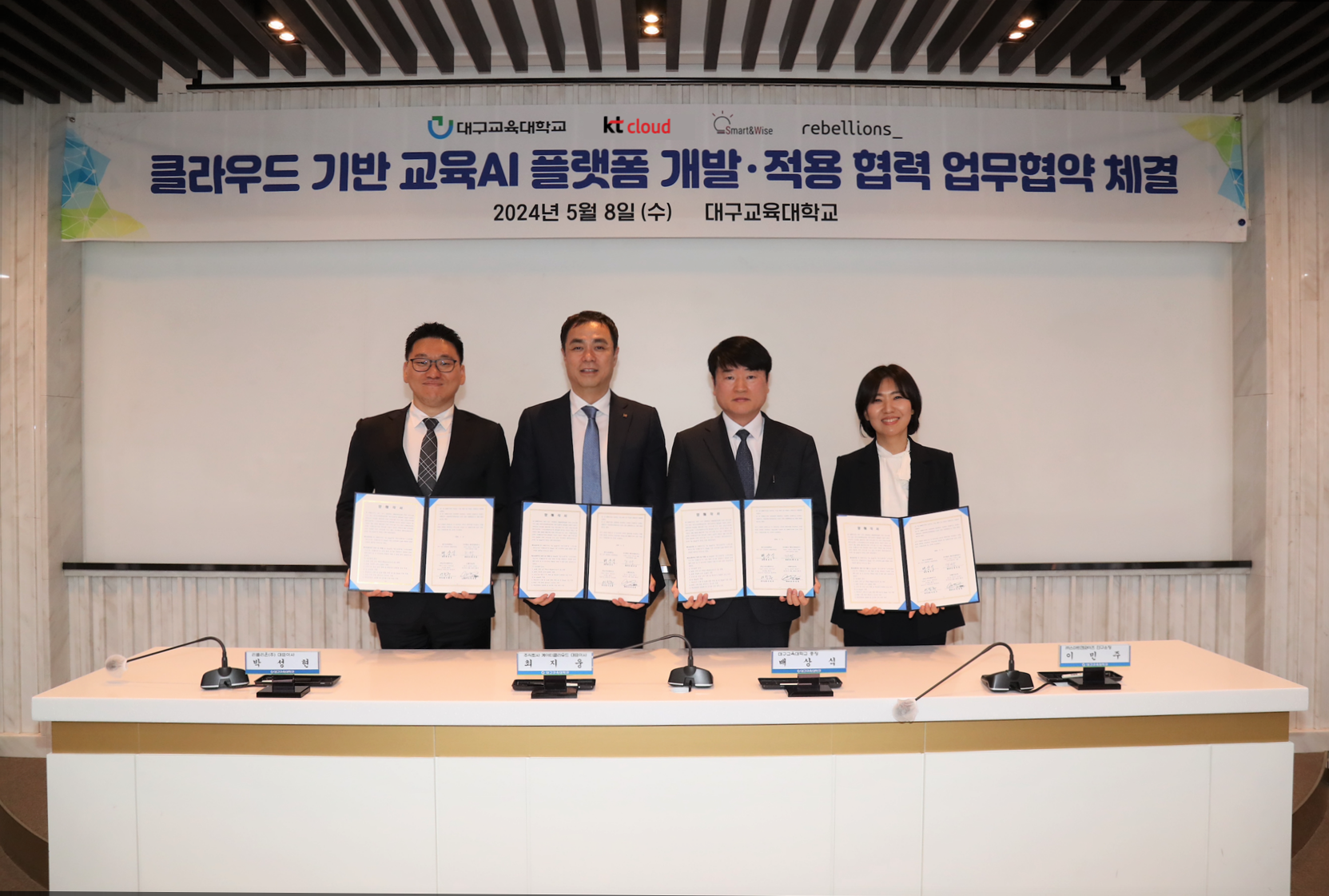 kt cloud(www.ktcloud.com, 대표이사 최지웅)는 대구교육대학교, 스마트앤와이즈, 리벨리온과 ‘클라우드 기반 교육 특화 AI서비스 개발 및 활성화를 위한 MOU’를 체결했다고 9일 밝혔다. 5월 8일 대구교육대학교에서 진행된 협약식에는 kt cloud 최지웅 대표이사, 대구교육대학교 배상식 총장, 스마트앤와이즈 이민주 연구소장, 리벨리온 박성현 대표이사가 참석했다.