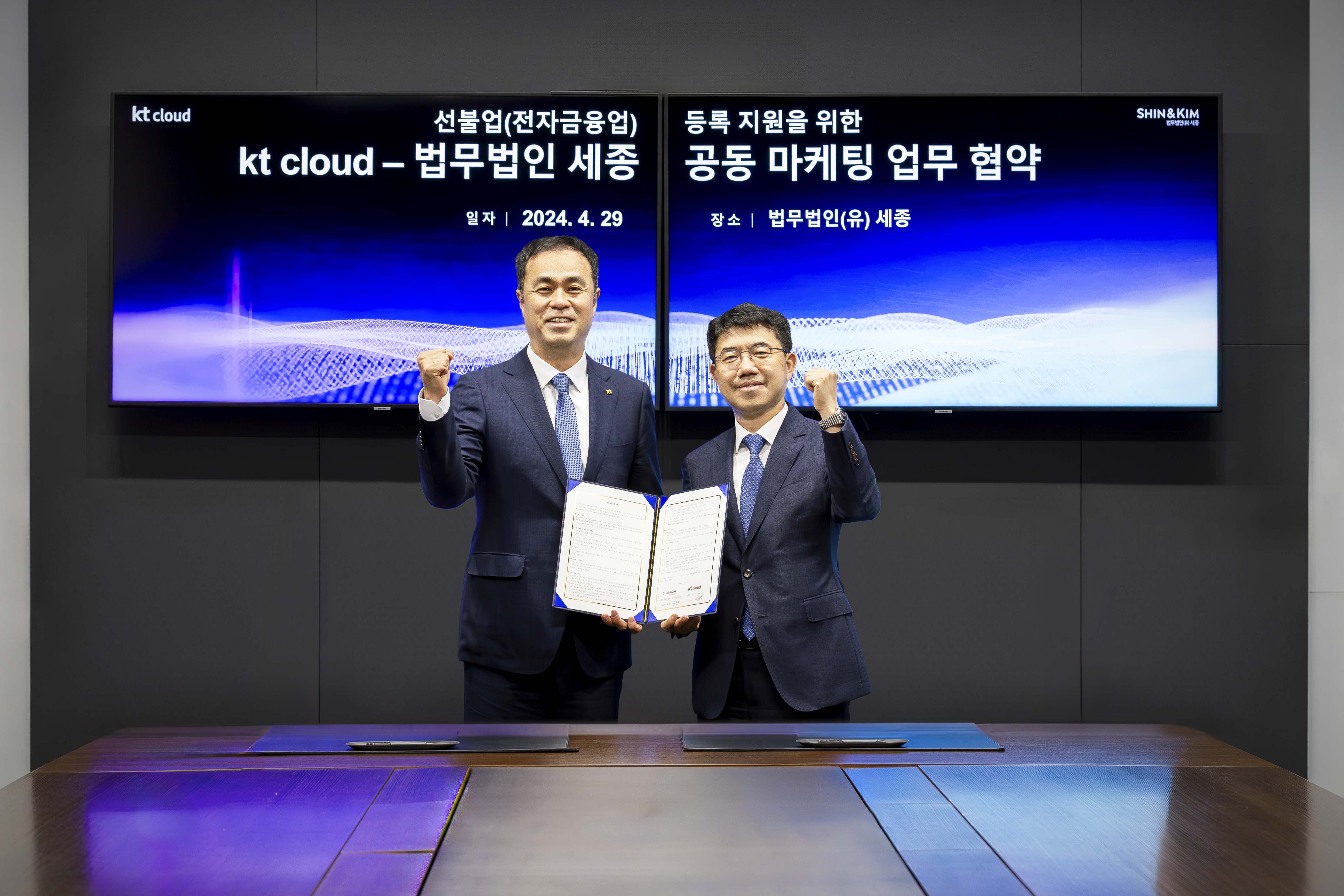 29일 오후, 세종(광화문) 사옥에서 열린 체결식에는 kt cloud 최지웅 대표, 세종 오종한 대표변호사를 비롯한 주요 관계자들이 참석해 선불업 등록 관련 물적설비, 법률자문 등 제공 및 금융 컴플라이언스 지원에 필요한 각 사의 역할과 협조방안에 대해 논의했다.