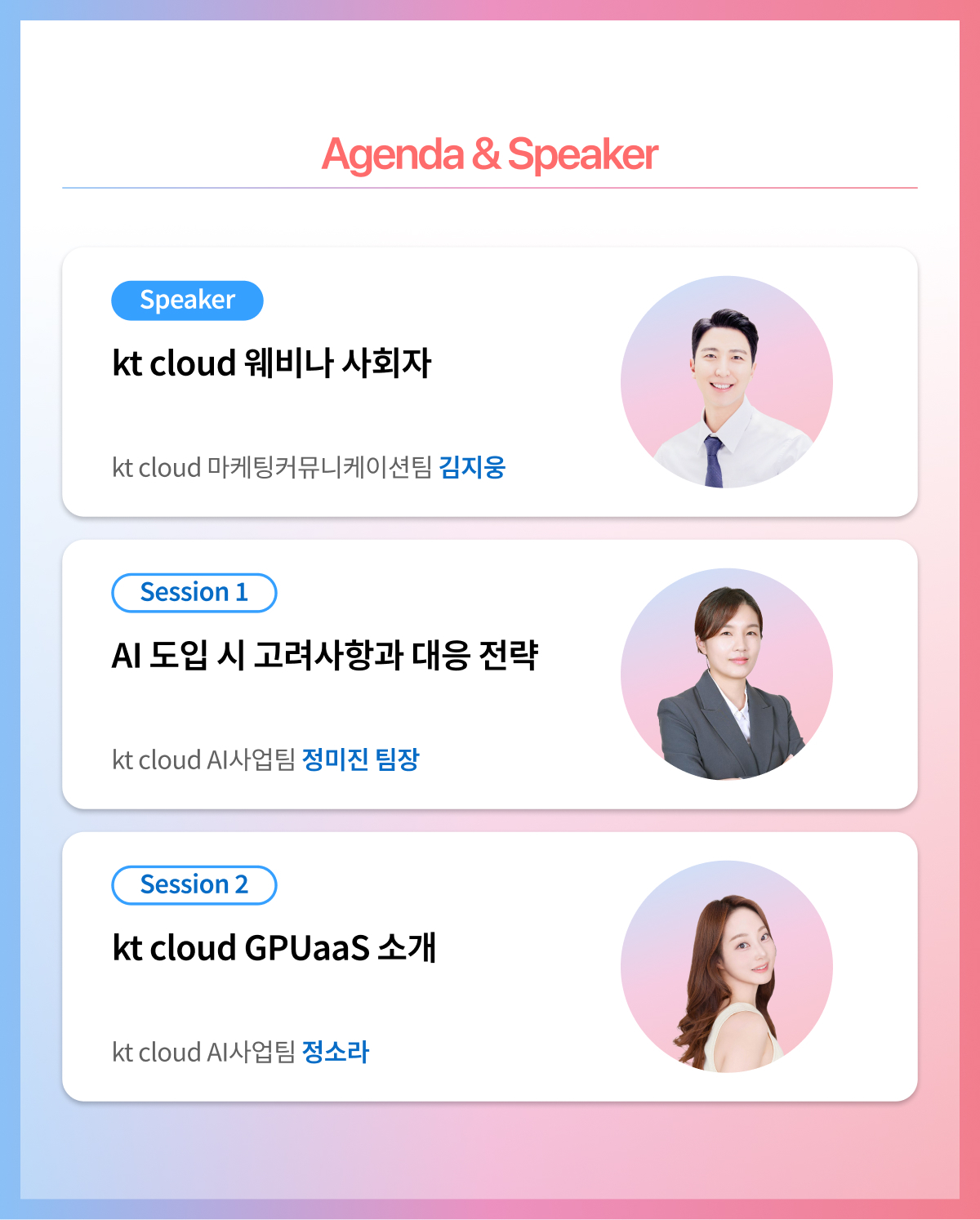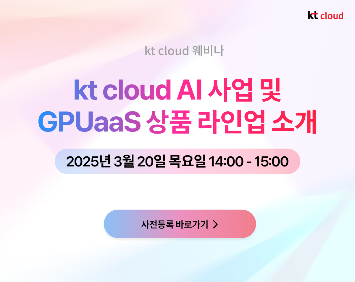 이러한 도전 과제를 해결하고 기업들의 AI 경쟁력을 극대화하기 위해, kt cloud는 ‘kt cloud AI 사업 및 GPUaaS 상품 라인업 소개’를 주제로 오는 3월 20일(목) 오후 2시부터 3시까지 온라인 세미나를 진행합니다.