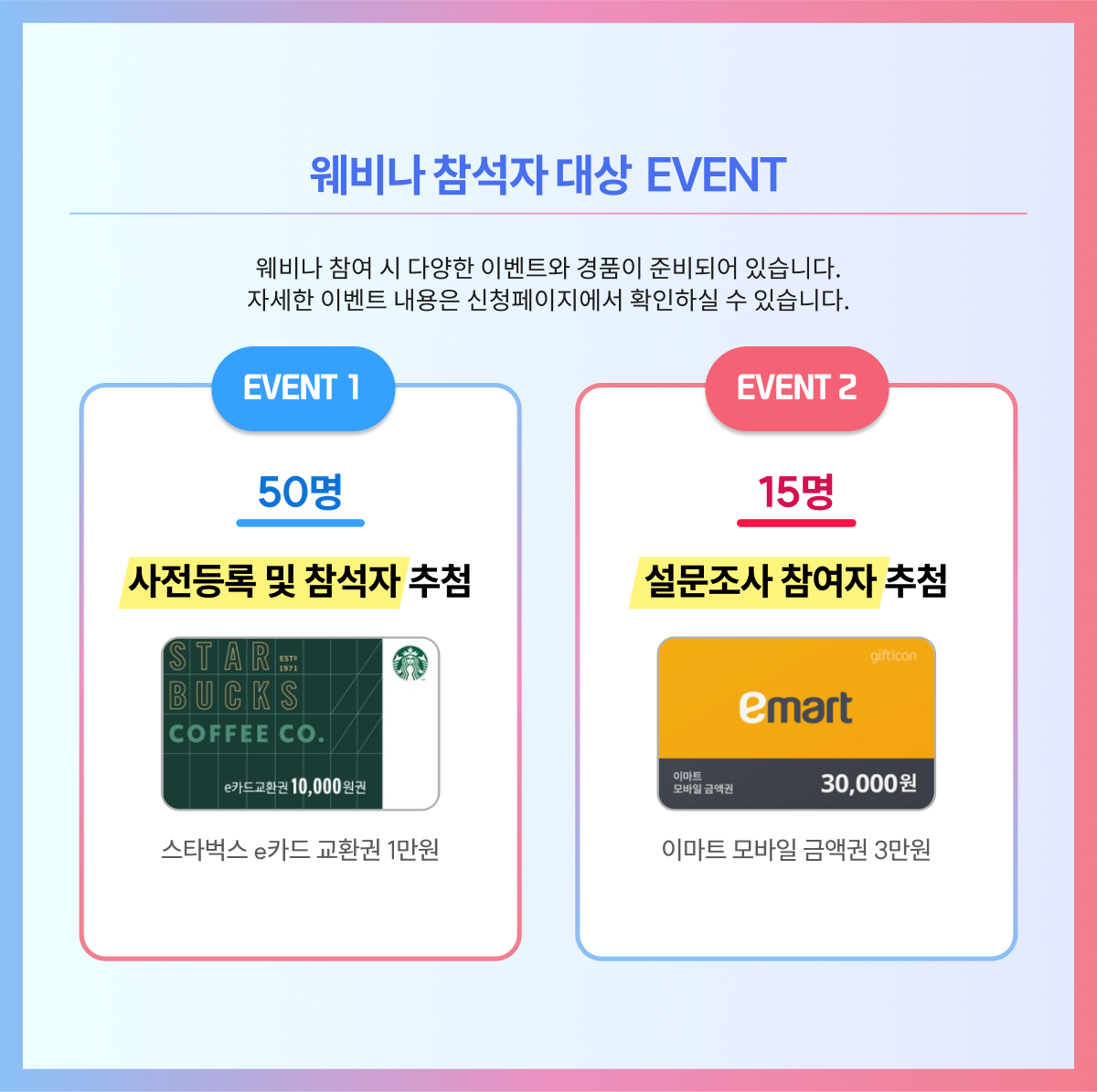 웨비나가 끝난 후 설문을 해주신 분들 중 추첨을 통해 15분께 이마트 금액권을 드립니다.