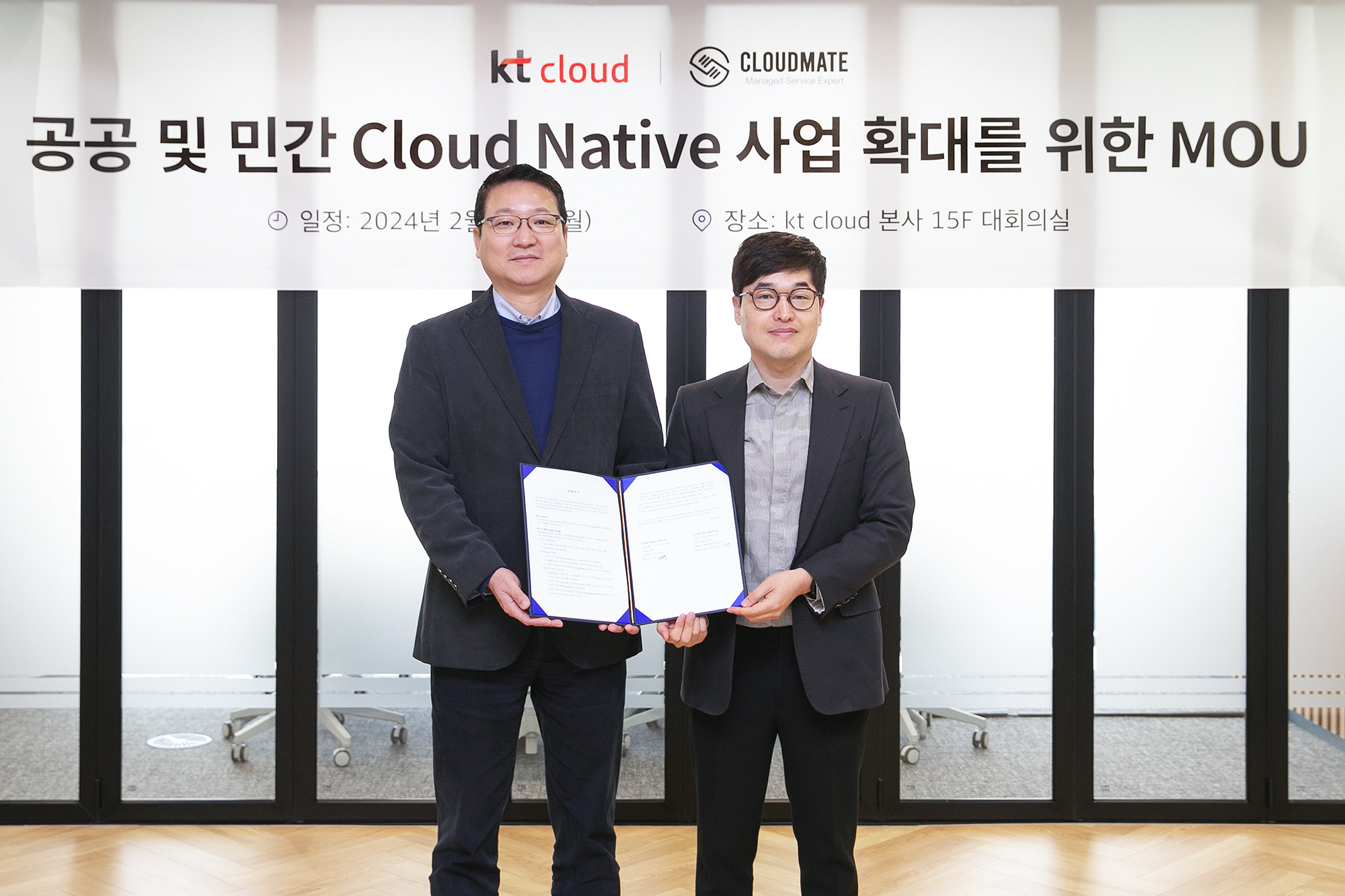 kt cloud(http://www.ktcloud.com, 대표이사 황태현)는 클라우드 네이티브 전문 기업 클라우드메이트(http://www.cloudmt.co.kr, 대표이사 고창규)와 공공 및 민간 클라우드 네이티브 사업 확대를 위한 전략적 제휴 협약(MOU)을 체결했다고 26일 밝혔다. 협약식에는 kt cloud 남충범 본부장, 클라우드메이트 고창규 대표이사 등 주요 관계자들이 참석해 향후 클라우드 네이티브 사업 협력 방안에 대해 논의했다.