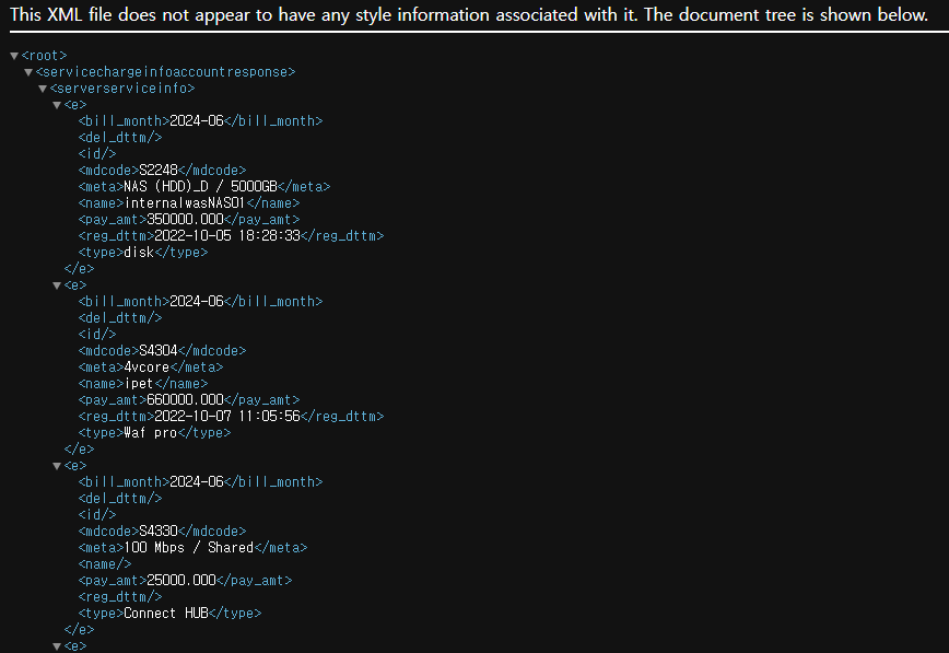 하지만 신규 파트너사거나, 내부 개발자분이 계시지 않다면 간단한 API도 사용하기 어려워하는 곳이 많습니다. 구조를 이해했더라도 API 호출을 웹브라우저로 호출하게 되면 아래와 같이 XML 형태로 출력되어 실제 청구서나 명세서 작업에 활용도가 떨어집니다.