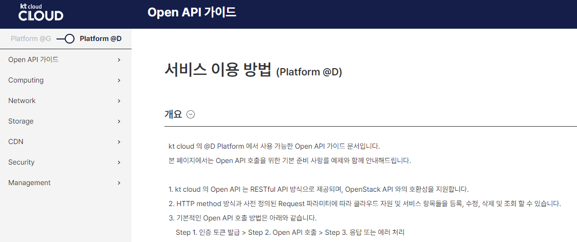 kt cloud 의 @D Platform 에서 사용 가능한 Open API 가이드 문서입니다. 본 페이지에서는 Open API 호출을 위한 기본 준비 사항를 예제와 함께 안내해드립니다. 1. kt cloud 의 Open API 는 RESTful API 방식으로 제