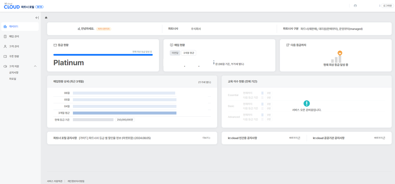kt cloud의 파트너 포털은 kt cloud 재판매를 하는 파트너사들이 실제 Cloud 자원과 빌링 내역, 청구서, 세금계산서까지 이어지는 일련의 행정 절차 뿐만 아니라 파트너사가 재판매시 필요로 하는 다양한 자료 제공, 공지사항을 확인할 수 있는 시스템입니다. '24년 9월에 오픈한 kt cloud의 파트너 포탈은 파트너사 입장에서 매입/매출 관리시 활용도가 높아 업무 부담을 줄여주고, 언제든지 자료 확인이 가능함에 따라 보다 빠르게 사업을 추진할 수 있도록 지원합니다.
