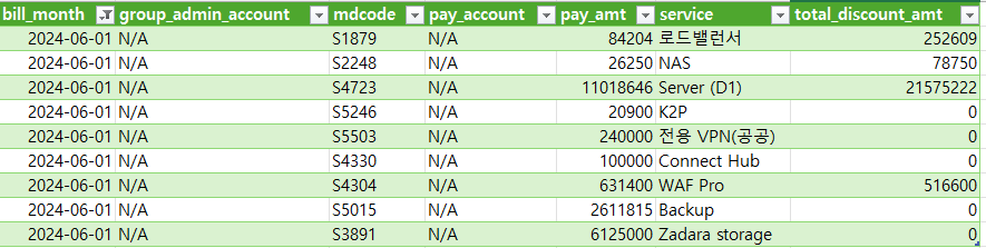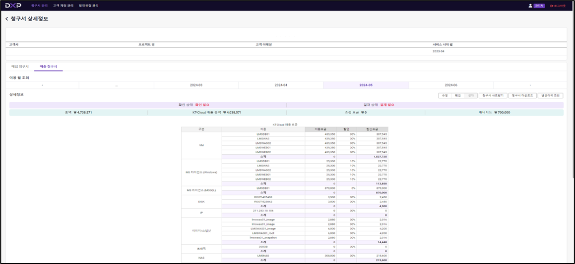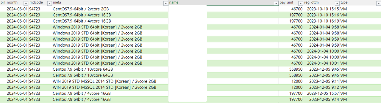 - 결과물 확인 : 서비스별 월 청구요금, 할인된 요금 내역, 세부 Cloud 자원별(VM, Disk 등) 표준 요금, 자원명, 스펙 정보, 생성/삭제일 확인 가능