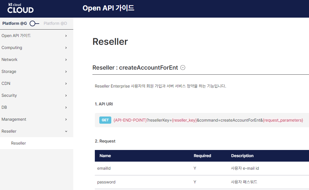 두 번째 API는 “Reseller API” 입니다. Reseller API는 말 그대로 재판매를 할 때 사용하는 API로써, kt cloud의 재판매 파트너(총판)만을 위한 API라고 할 수 있습니다. 특정 업체를 위해서만 제공 되는 API다보니 인증된 파트너사에만 공개가 됩니다. 인증 받은 파트너사의 경우 인증된 Cloud 계정으로 로그인을 하면 다음과 같이 Reseller API 가이드를 확인할 수 있습니다.
