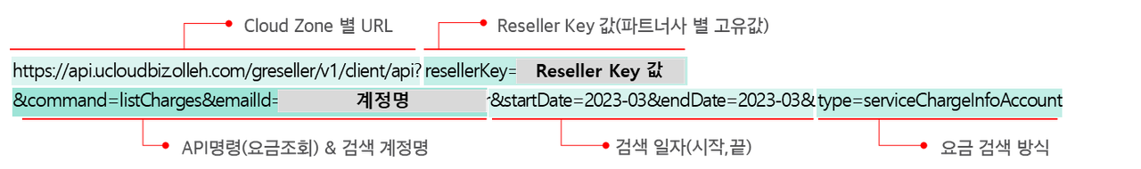 그 중에서도 파트너사에서 가장 많이 이용하는 Reseller API는 특정 계정의 월별 상세 요금 조회하는 기능입니다. 월별 상세 요금을 조회하는 API 호출 예시는 다음과 같습니다. [Cloud Zone 별 API-END-POINT + Reseller Key + Command + 계정명 + 검색일자 + 요금 검색 방식(Parameter)] 형태로 구성이 되는데 이때 유의사항은 계정명 같은 곳에 “@”와 같은 문자는 “%40” 치환을 해서 호출을 해야 한다는 점만 유의하시면 되겠습니다.