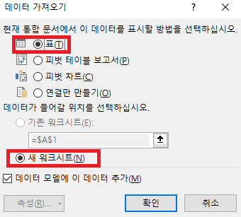 - “데이터 가져오기” 창에서 “표”, “새 워크시트” 선택 후 “확인” 버튼 클릭