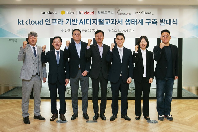kt cloud(http://www.ktcloud.com, 대표이사 윤동식)는 리벨리온, 비트루브, 스마트앤와이즈, 유니닥스, 지학사와 함께 ‘kt cloud 인프라 기반 AI디지털교과서 생태계 구축 발대식’을 진행했다고 26일 밝혔다. 전일 열린 행사에는 kt cloud 윤동식 대표, 리벨리온 박성현 대표, 비트루브 오태형 대표, 스마트앤와이즈 이민주 연구소장, 유니닥스 이영석 상무, 지학사 김성원 본부장 등 주요 관계자들이 참석했다.