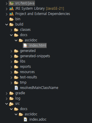 Junit으로 작성된 Test 코드들을 실행되고 build/docs/asciidoc/ 위치에 index.html이 생성됩니다.