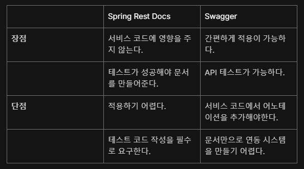 Spring Rest Docs, Swagger는 다음과 같은 장단점이 존재합니다.